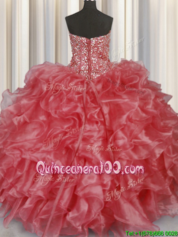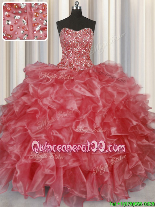 Neckline : StraplessShown Color : Coral RedSilhouette : Ball GownsSleeve Length : sleevelessHemline : floor lengthBack Detail : Lace upFabric : OrganzaEmbellishment : Beading,RufflesOccasion : Military Ball,Sweet 16,QuinceaneraSeason : Spring,Summer,Fall,Winter