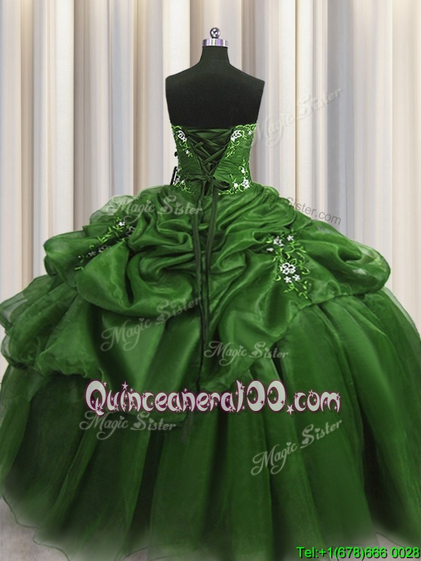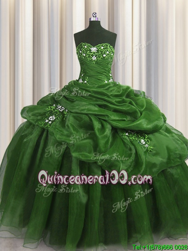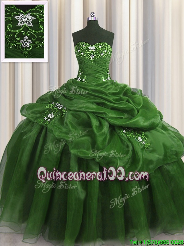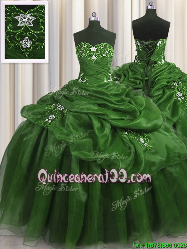 Neckline : SweetheartShown Color : GreenSilhouette : Ball GownsSleeve Length : sleevelessHemline : floor lengthBack Detail : Lace upFabric : OrganzaEmbellishment : Beading,Appliques,Pick UpsOccasion : Military Ball,Sweet 16,QuinceaneraSeason : Spring,Summer,Fall,Winter