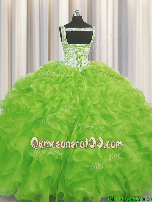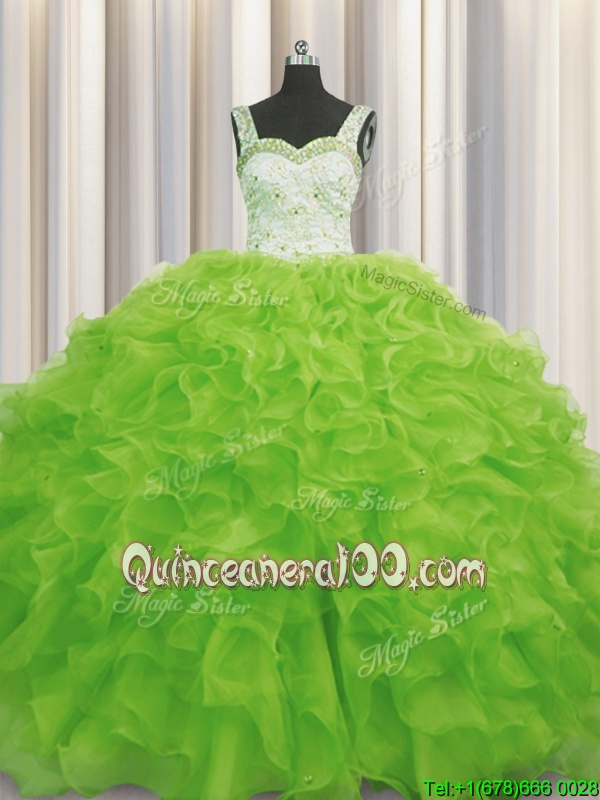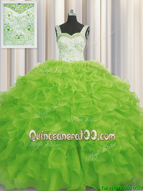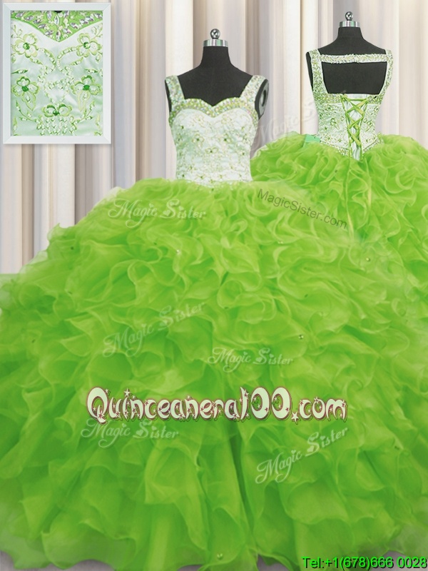 Neckline : StrapsShown Color : Yellow GreenSilhouette : Ball GownsSleeve Length : sleevelessHemline : floor lengthBack Detail : Lace upFabric : OrganzaEmbellishment : Beading,RufflesOccasion : Military Ball,Sweet 16,QuinceaneraSeason : Spring,Summer,Fall,Winter