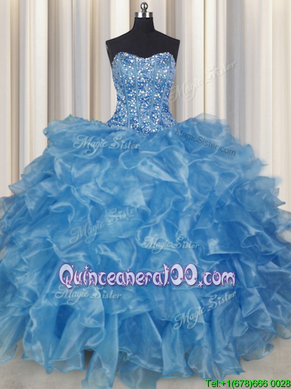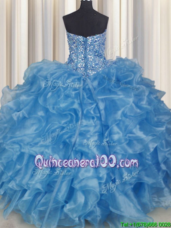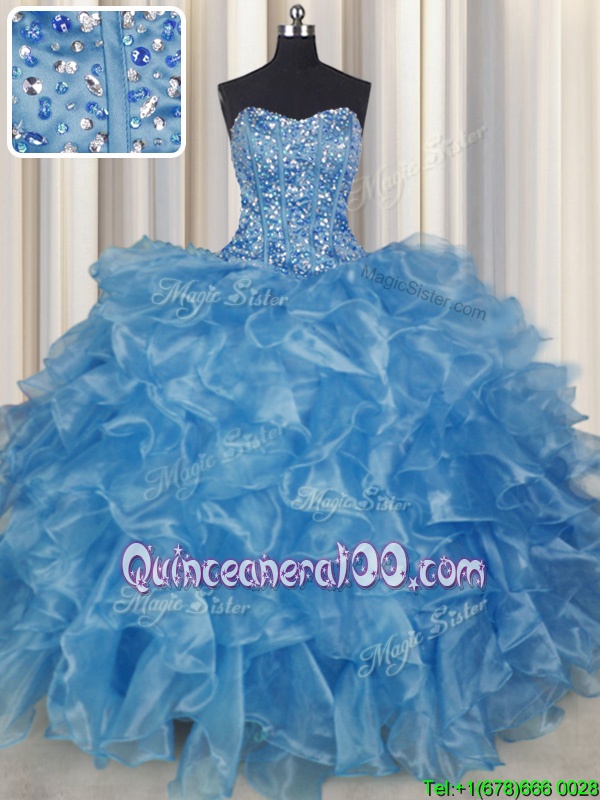 Neckline : StraplessShown Color : Baby BlueSilhouette : Ball GownsSleeve Length : sleevelessHemline : floor lengthBack Detail : Lace upFabric : OrganzaEmbellishment : Beading,RufflesOccasion : Military Ball,Sweet 16,QuinceaneraSeason : Spring,Summer,Fall,Winter
