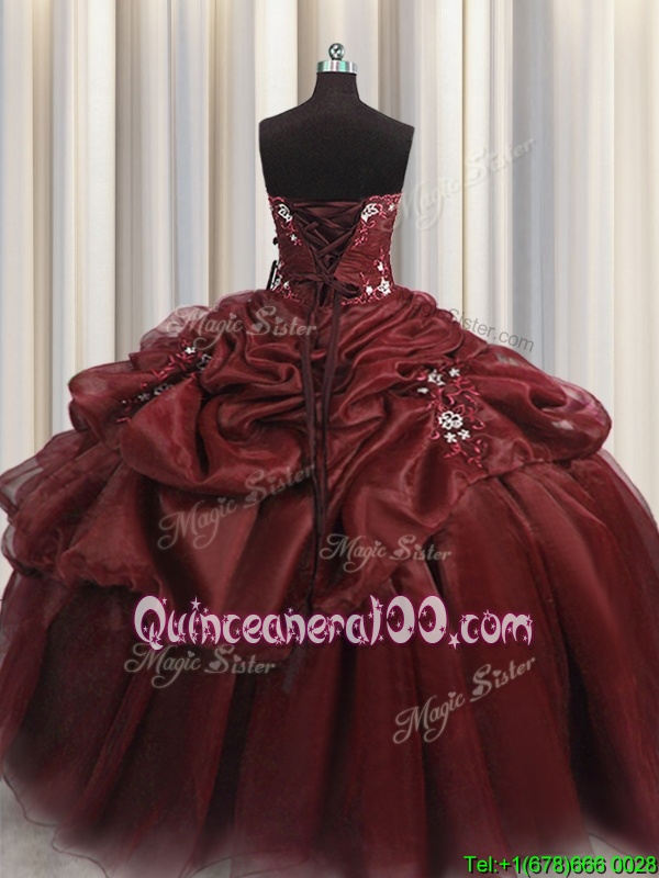 Neckline : SweetheartShown Color : BurgundySilhouette : Ball GownsSleeve Length : sleevelessHemline : floor lengthBack Detail : Lace upFabric : OrganzaEmbellishment : Beading,Appliques,Pick UpsOccasion : Military Ball,Sweet 16,QuinceaneraSeason : Spring,Summer,Fall,Winter