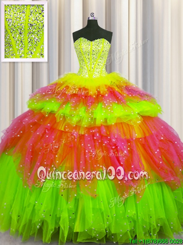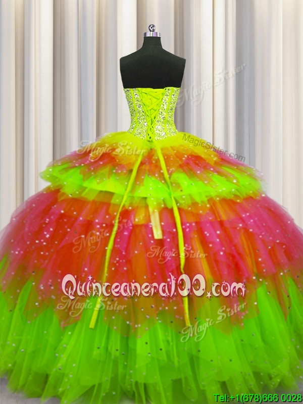 Decent Bling-bling Visible Boning Multi-color Sleeveless Floor Length Beading and Ruffles and Ruffled Layers and Sequins Lace Up 15 Quinceanera Dress