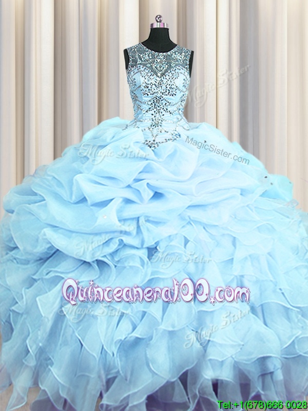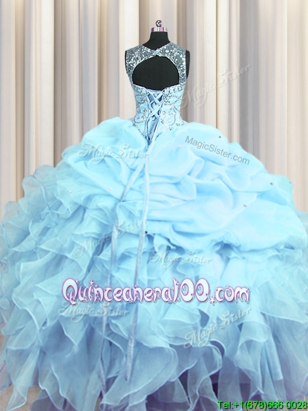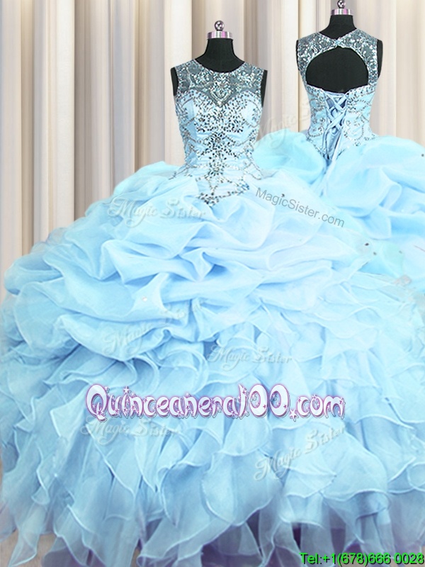 Neckline : ScoopShown Color : Light BlueSilhouette : Ball GownsSleeve Length : sleevelessHemline : floor lengthBack Detail : Lace upFabric : OrganzaEmbellishment : Beading,Ruffles,Pick UpsOccasion : Military Ball,Sweet 16,QuinceaneraSeason : Spring,Summer,Fall,Winter