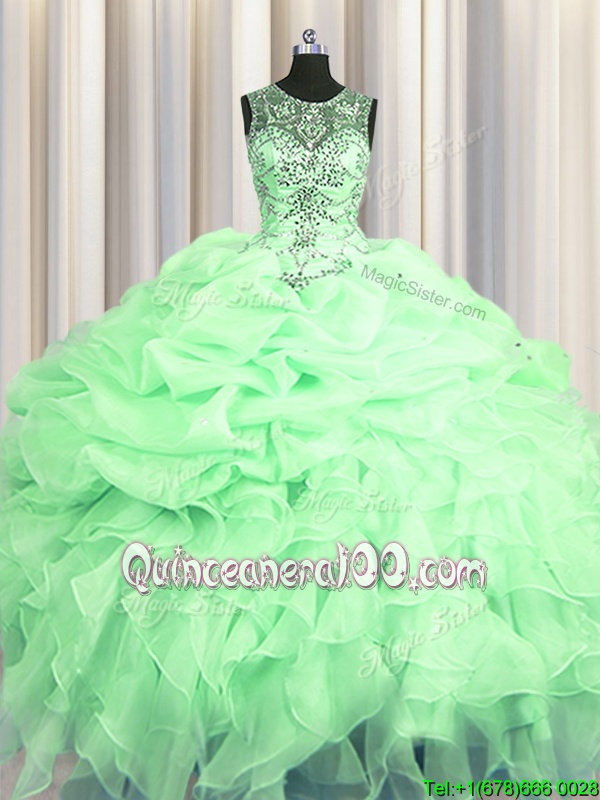 Neckline : ScoopShown Color : Apple GreenSilhouette : Ball GownsSleeve Length : sleevelessHemline : floor lengthBack Detail : Lace upFabric : OrganzaEmbellishment : Beading,Ruffles,Pick UpsOccasion : Military Ball,Sweet 16,QuinceaneraSeason : Spring,Summer,Fall,Winter