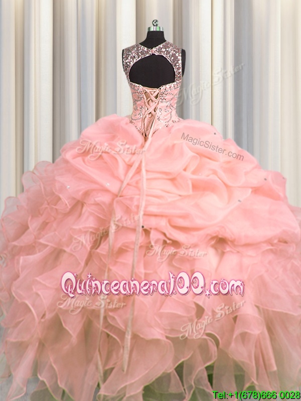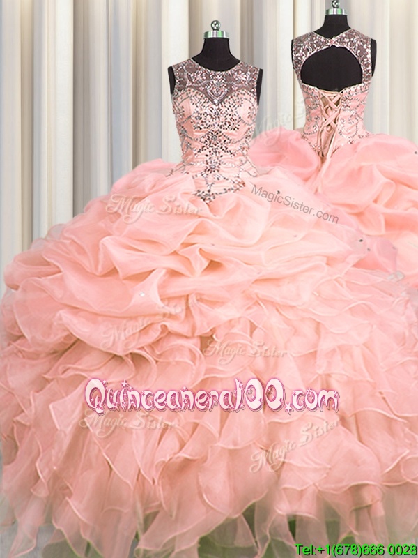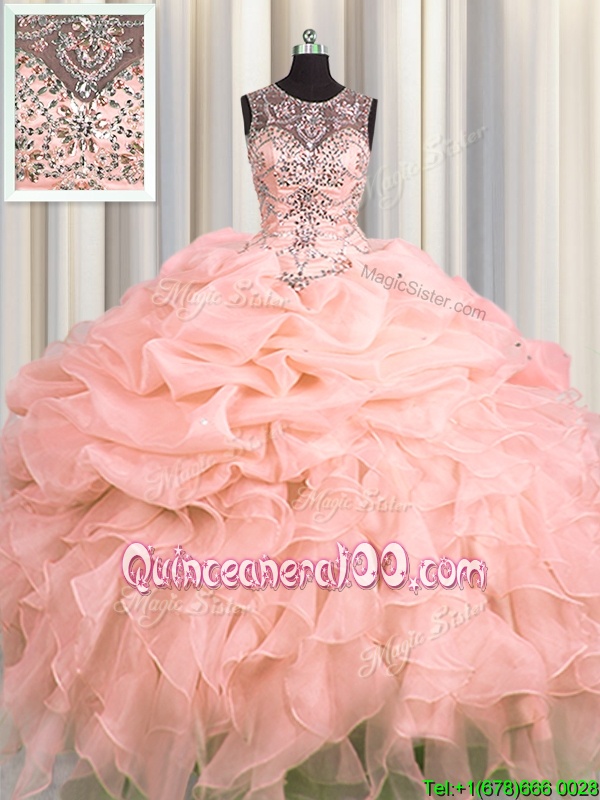 Superior See Through Peach Vestidos de Quinceanera Military Ball and Sweet 16 and Quinceanera and For withBeading and Ruffles and Pick Ups Scoop Sleeveless Lace Up