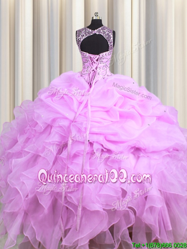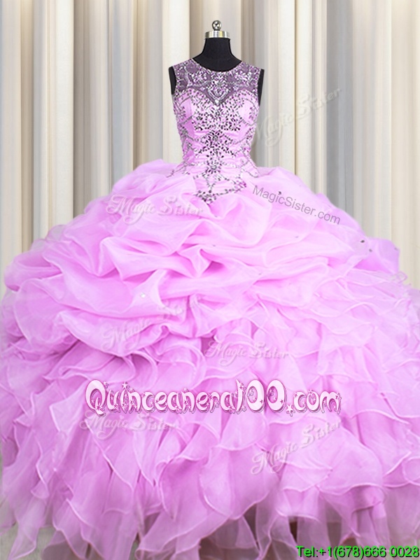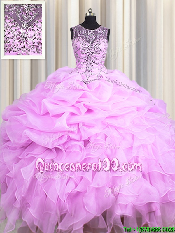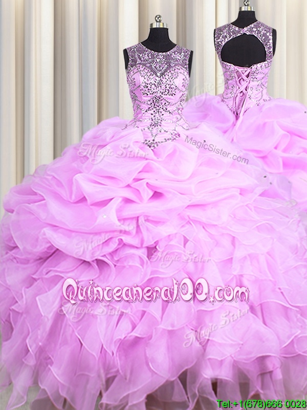 Beauteous See Through Ball Gowns Quinceanera Gown Lilac Scoop Organza Sleeveless Floor Length Lace Up