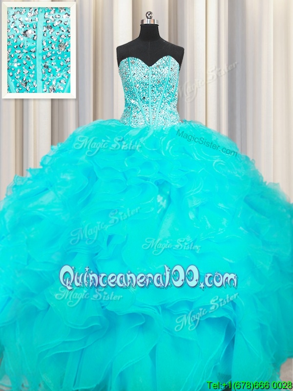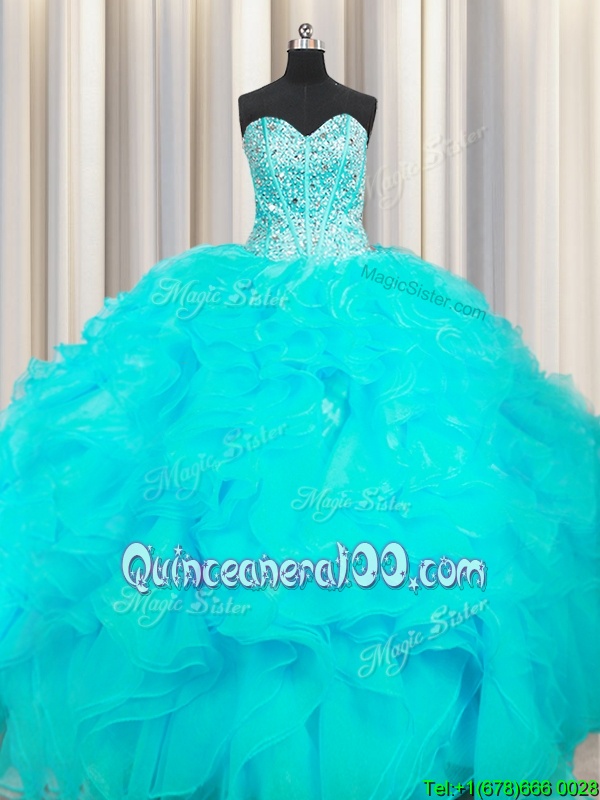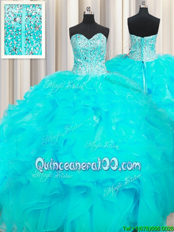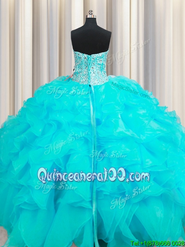 Custom Fit Visible Boning Beaded Bodice Aqua Blue Sweetheart Lace Up Beading and Ruffles Sweet 16 Quinceanera Dress Sleeveless