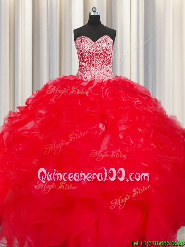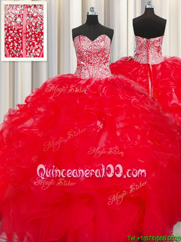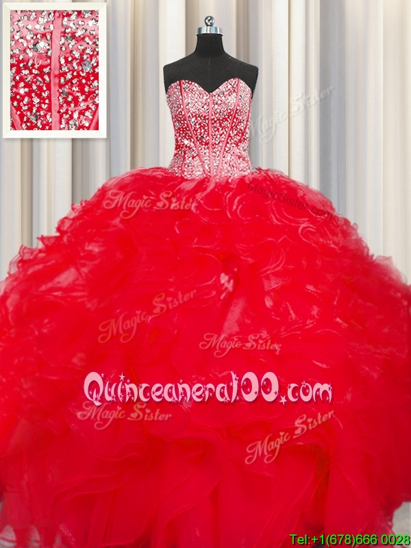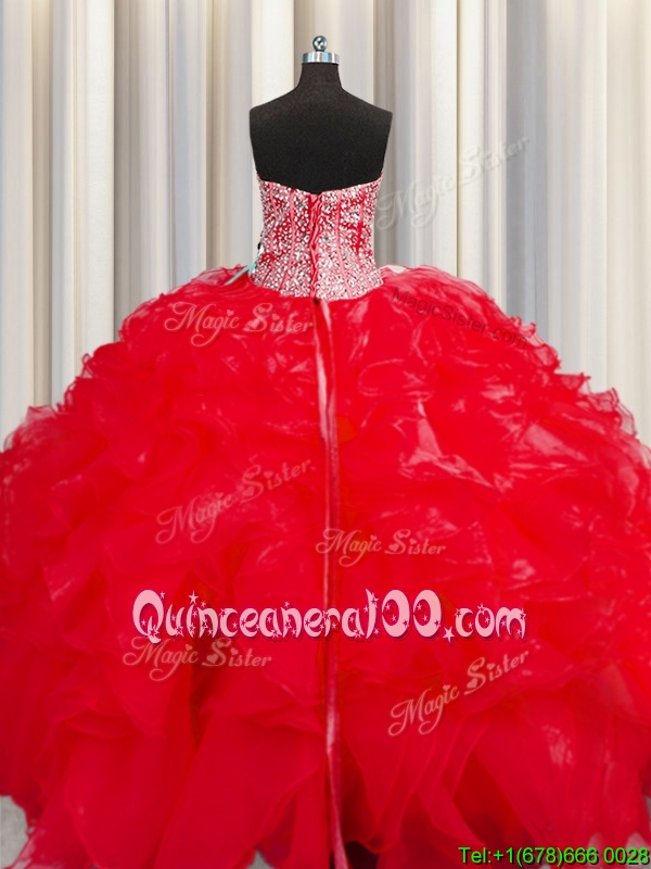 High Quality Visible Boning Beaded Bodice Red Quince Ball Gowns Military Ball and Sweet 16 and Quinceanera and For withBeading and Ruffles Sweetheart Sleeveless Lace Up
