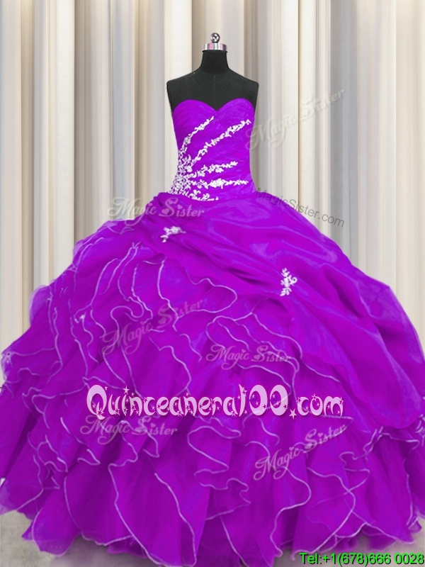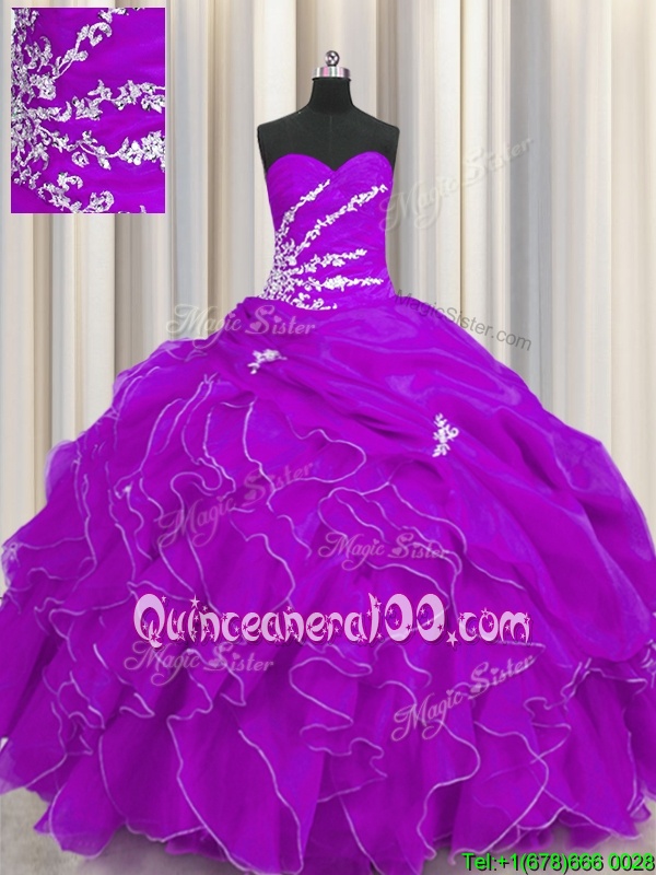 Neckline : SweetheartShown Color : PurpleSilhouette : Ball GownsSleeve Length : sleevelessHemline : floor lengthBack Detail : Lace upFabric : OrganzaEmbellishment : Beading,Appliques,RufflesOccasion : Military Ball,Sweet 16,QuinceaneraSeason : Spring,Summer,Fall,Winter