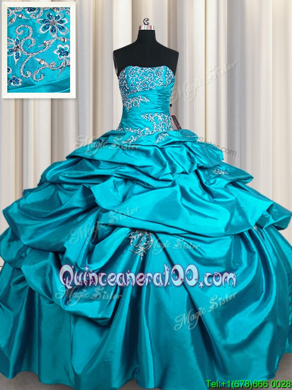 Neckline : StraplessShown Color : Aqua BlueSilhouette : Ball GownsSleeve Length : sleevelessHemline : floor lengthBack Detail : Lace upFabric : TaffetaEmbellishment : Appliques,Pick UpsOccasion : Military Ball,Sweet 16,QuinceaneraSeason : Spring,Summer,Fall,Winter
