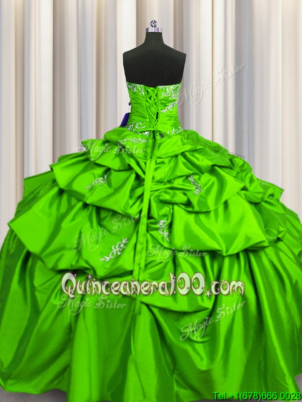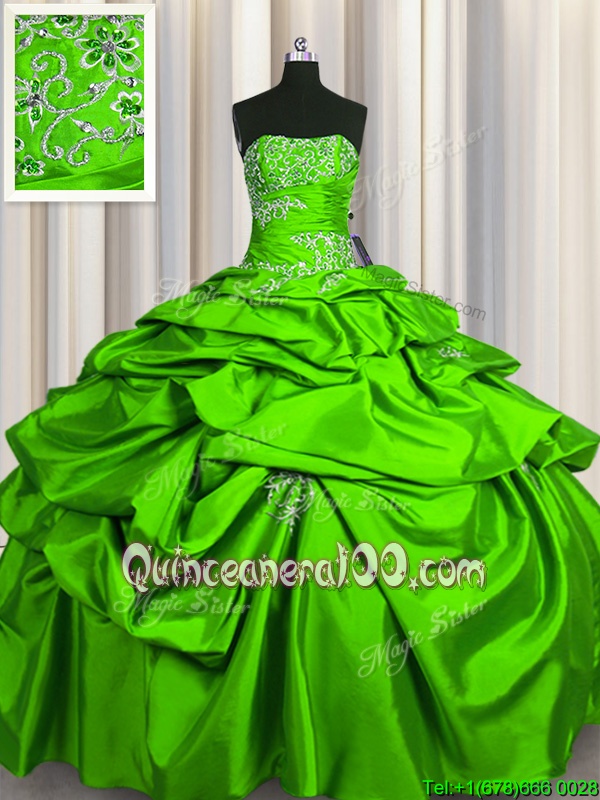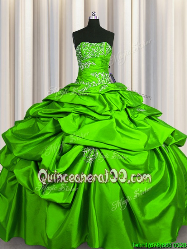 Neckline : StraplessShown Color : Spring GreenSilhouette : Ball GownsSleeve Length : sleevelessHemline : floor lengthBack Detail : Lace upFabric : TaffetaEmbellishment : Beading,Pick UpsOccasion : Military Ball,Sweet 16,QuinceaneraSeason : Spring,Summer,Fall,Winter
