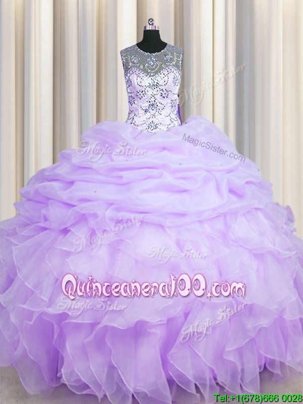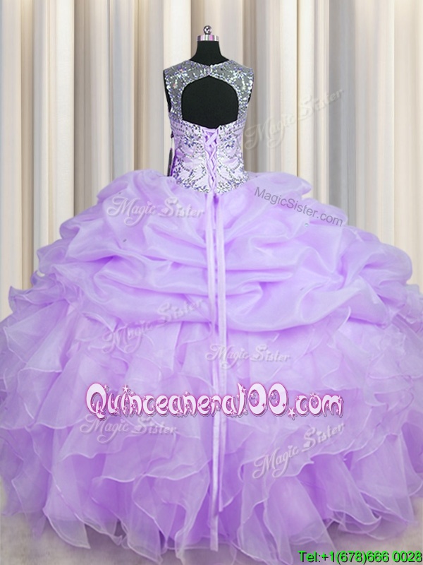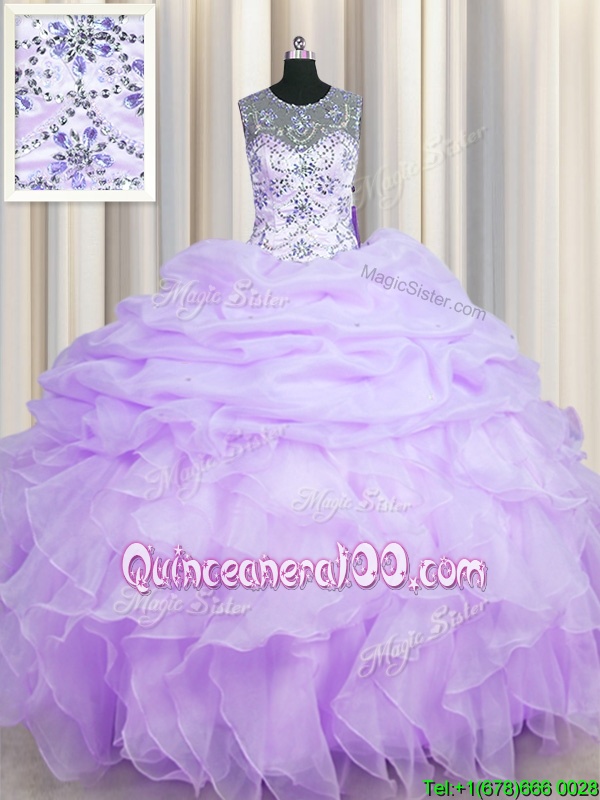 Neckline : ScoopShown Color : LavenderSilhouette : Ball GownsSleeve Length : sleevelessHemline : floor lengthBack Detail : Lace upFabric : OrganzaEmbellishment : Beading,Ruffles,Pick UpsOccasion : Military Ball,Sweet 16,QuinceaneraSeason : Spring,Summer,Fall,Winter