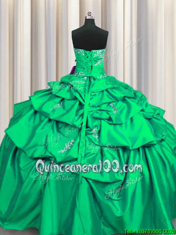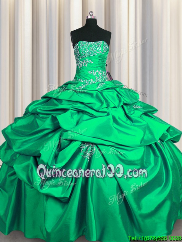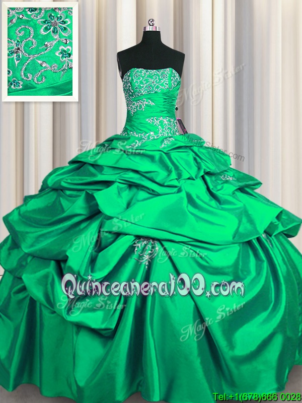 Neckline : StraplessShown Color : TurquoiseSilhouette : Ball GownsSleeve Length : sleevelessHemline : floor lengthBack Detail : Lace upFabric : TaffetaEmbellishment : Appliques,Pick UpsOccasion : Military Ball,Sweet 16,QuinceaneraSeason : Spring,Summer,Fall,Winter