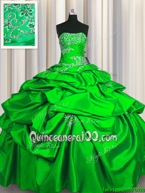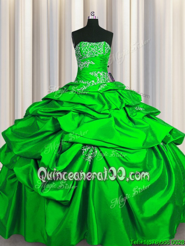 Neckline : StraplessShown Color : GreenSilhouette : Ball GownsSleeve Length : sleevelessHemline : floor lengthBack Detail : Lace upFabric : TaffetaEmbellishment : Appliques,Pick UpsOccasion : Military Ball,Sweet 16,QuinceaneraSeason : Spring,Summer,Fall,Winter