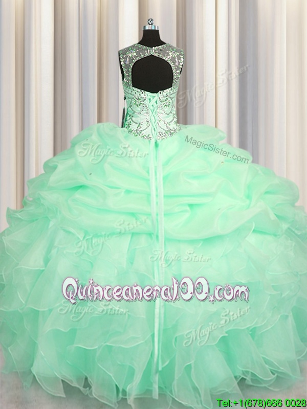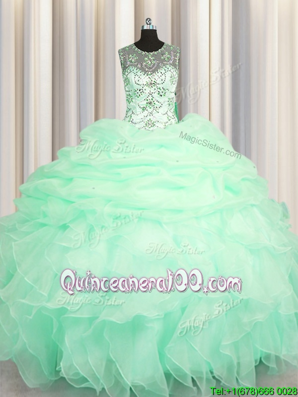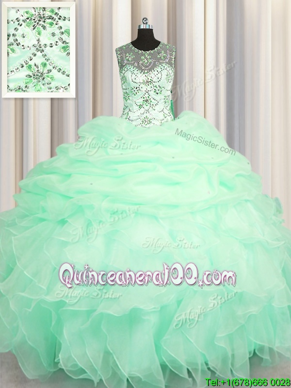 Neckline : ScoopShown Color : Apple GreenSilhouette : Ball GownsSleeve Length : sleevelessHemline : floor lengthBack Detail : Lace upFabric : OrganzaEmbellishment : Beading,Ruffles,Pick UpsOccasion : Military Ball,Sweet 16,QuinceaneraSeason : Spring,Summer,Fall,Winter