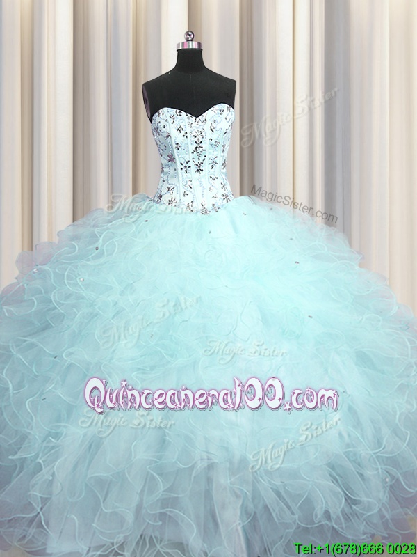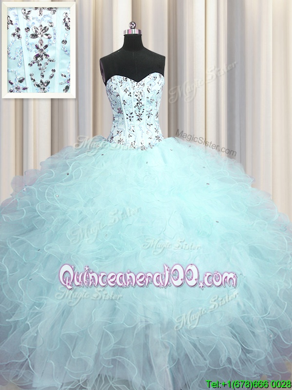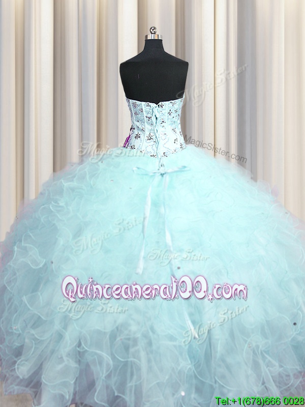 Neckline : SweetheartShown Color : Light BlueSilhouette : Ball GownsSleeve Length : sleevelessHemline : floor lengthBack Detail : Lace upFabric : TulleEmbellishment : Beading,Appliques,RufflesOccasion : Military Ball,Sweet 16,QuinceaneraSeason : Spring,Summer,Fall,Winter