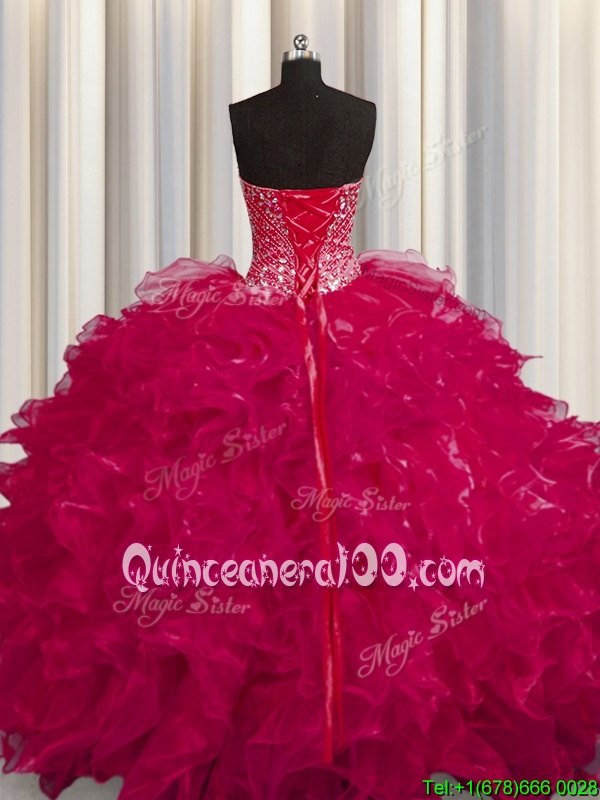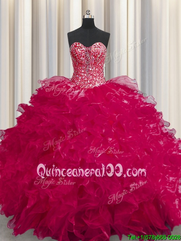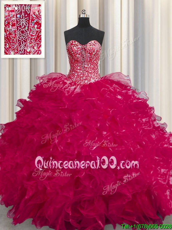 Super See Through Coral Red Lace Up Sweetheart Beading and Ruffles Sweet 16 Dresses Organza Sleeveless