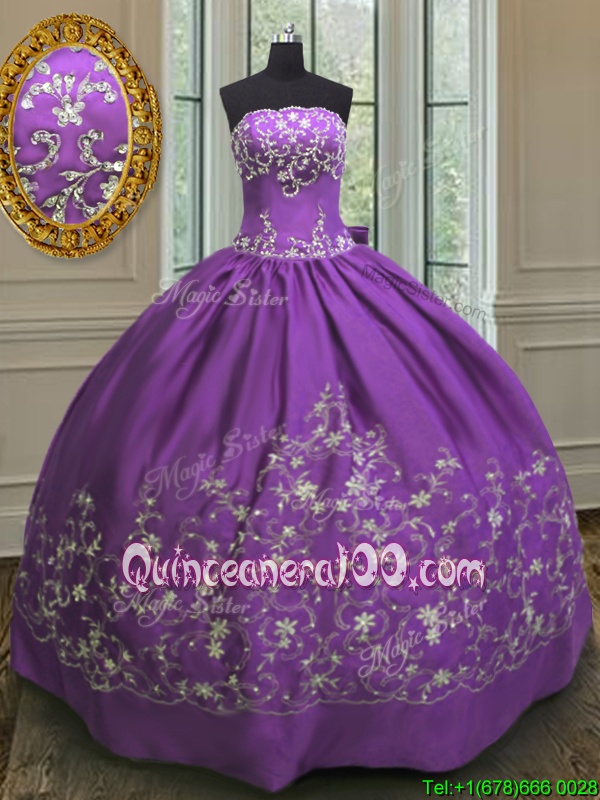 Neckline : StraplessShown Color : Eggplant PurpleSilhouette : Ball GownsSleeve Length : sleevelessHemline : floor lengthBack Detail : Lace upFabric : SatinEmbellishment : EmbroideryOccasion : Military Ball,Sweet 16,QuinceaneraSeason : Spring,Summer,Fall,Winter