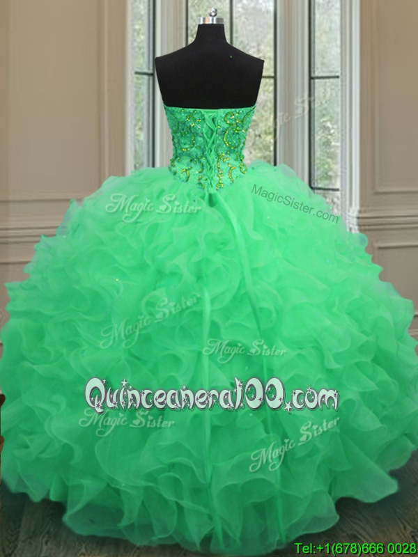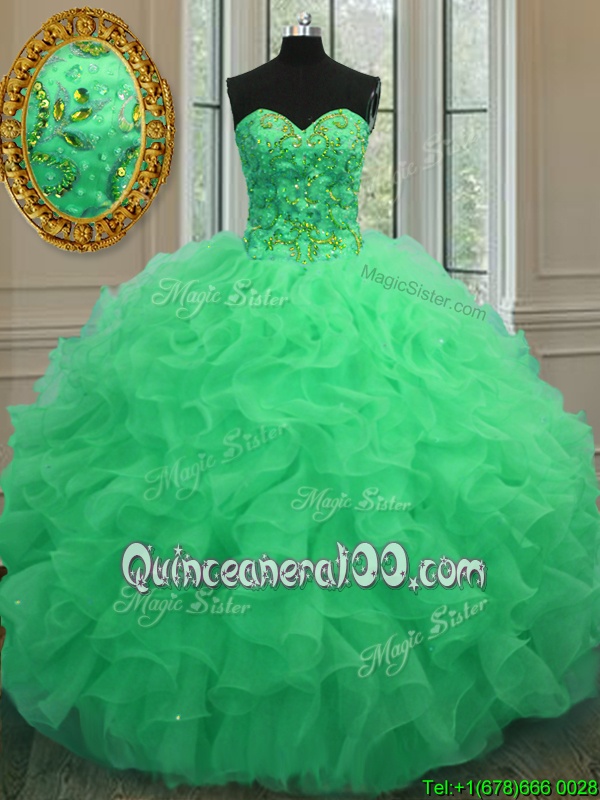 Amazing Sweetheart Sleeveless Vestidos de Quinceanera Floor Length Beading and Ruffles Green Organza