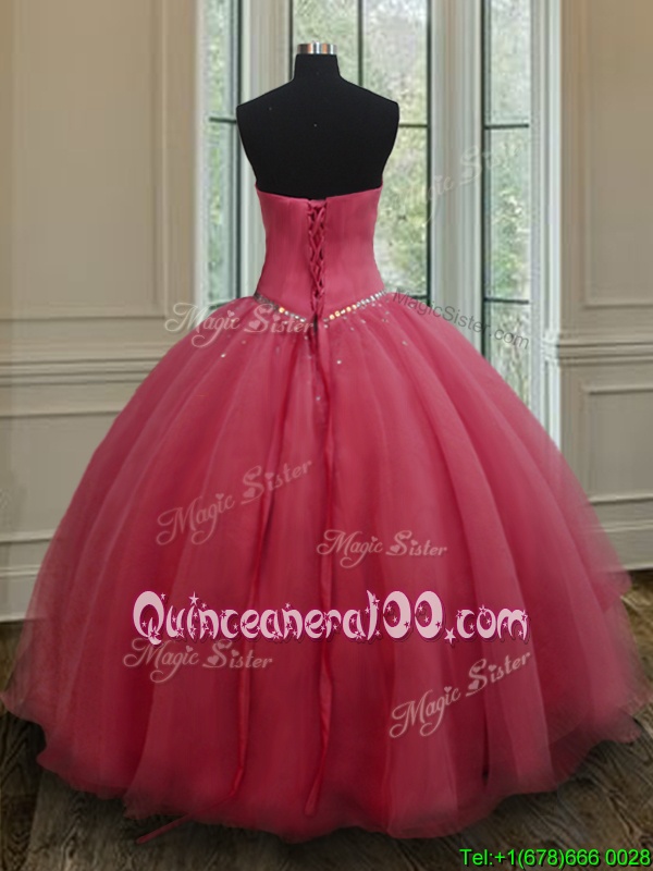 Neckline : SweetheartShown Color : Watermelon RedSilhouette : Ball GownsSleeve Length : sleevelessHemline : floor lengthBack Detail : Lace upFabric : OrganzaEmbellishment : Beading,RuchingOccasion : Military Ball,Sweet 16,QuinceaneraSeason : Spring,Summer,Fall,Winter