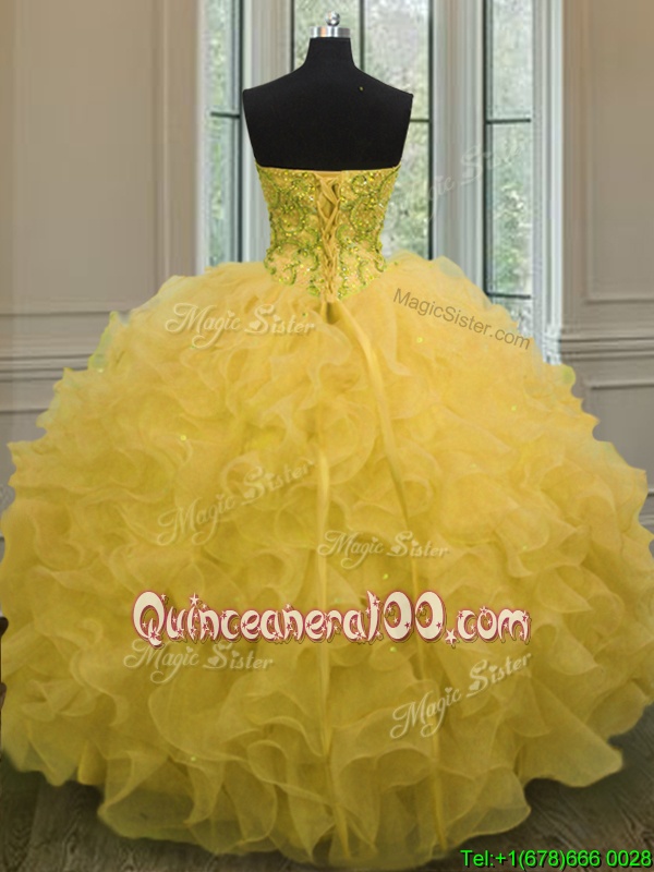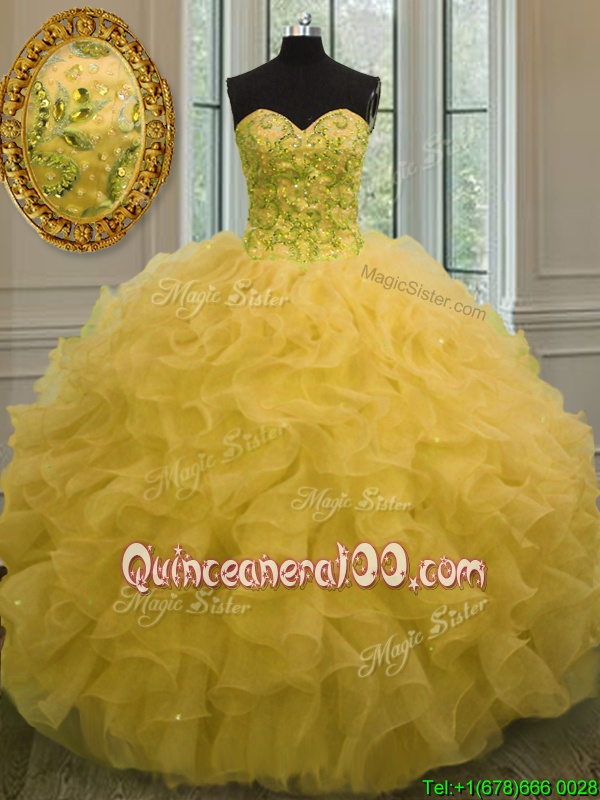 Neckline : SweetheartShown Color : GoldSilhouette : Ball GownsSleeve Length : sleevelessHemline : floor lengthBack Detail : Lace upFabric : OrganzaEmbellishment : Beading,RufflesOccasion : Military Ball,Sweet 16,QuinceaneraSeason : Spring,Summer,Fall,Winter