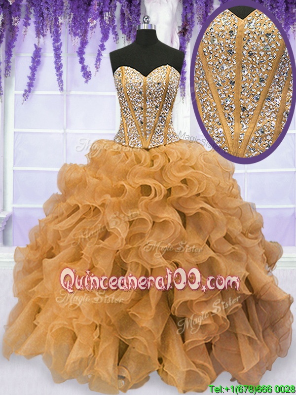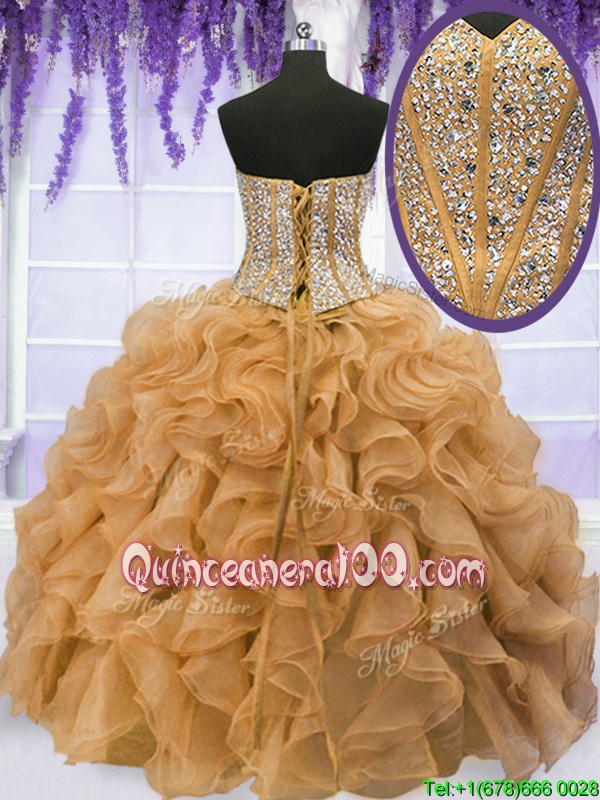 Neckline : SweetheartShown Color : GoldSilhouette : Ball GownsSleeve Length : sleevelessHemline : floor lengthBack Detail : Lace upFabric : OrganzaEmbellishment : Beading,RufflesOccasion : Military Ball,Sweet 16,QuinceaneraSeason : Spring,Summer,Fall,Winter