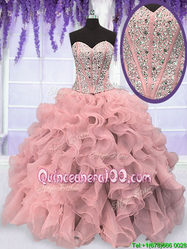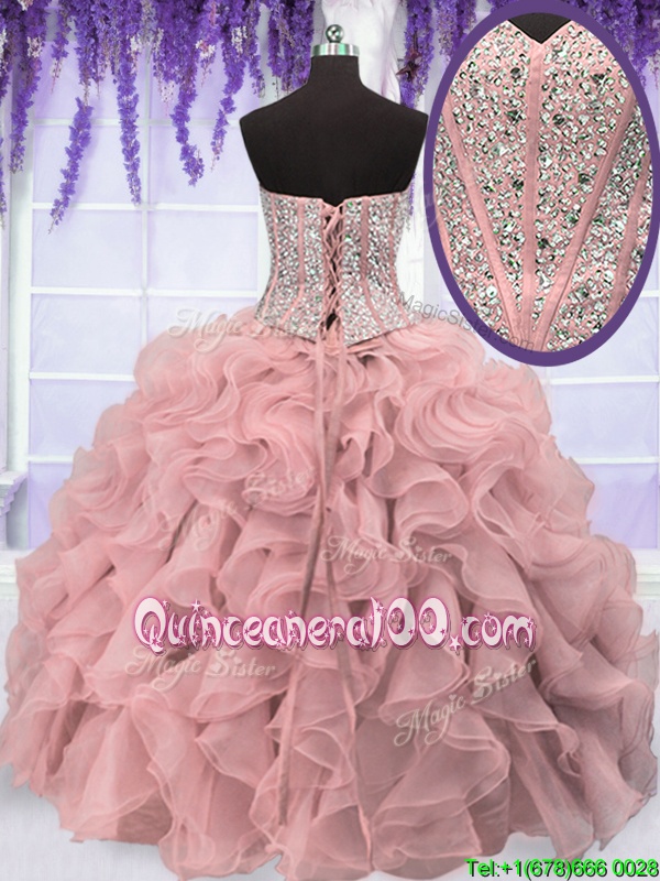 Neckline : SweetheartShown Color : Pink Silhouette : Ball GownsSleeve Length : sleevelessHemline : floor lengthBack Detail : Lace upFabric : OrganzaEmbellishment : Beading,RufflesOccasion : Military Ball,Sweet 16,QuinceaneraSeason : Spring,Summer,Fall,Winter