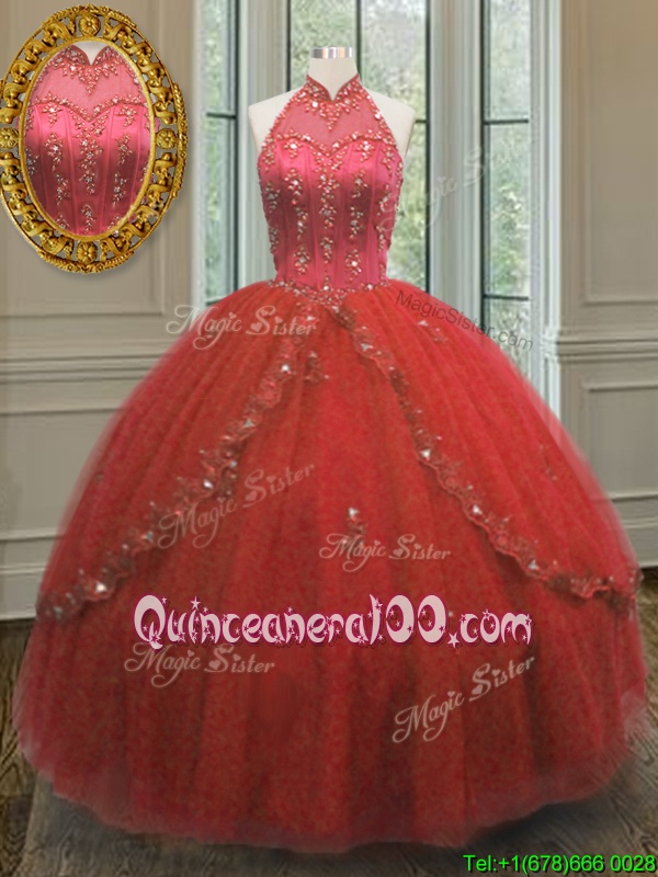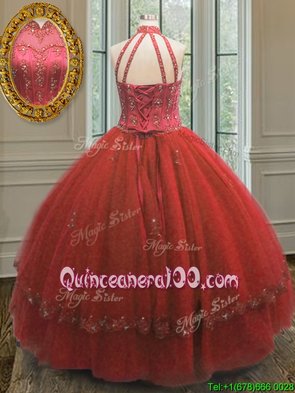 Neckline : Halter topShown Color : Wine RedSilhouette : Ball GownsSleeve Length : sleevelessHemline : floor lengthBack Detail : Lace upFabric : TulleEmbellishment : Beading,AppliquesOccasion : Military Ball,Sweet 16,QuinceaneraSeason : Spring,Summer,Fall,Winter