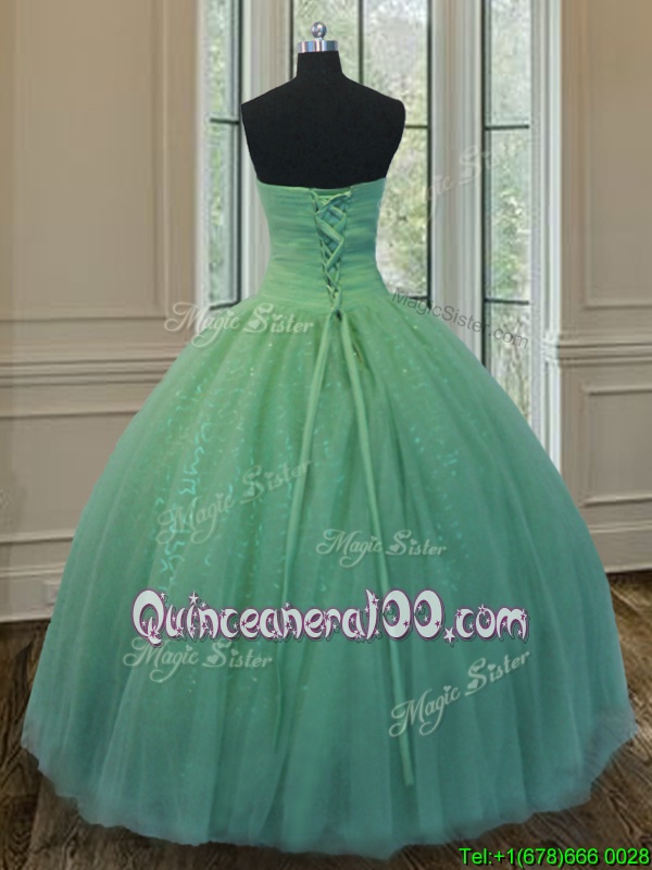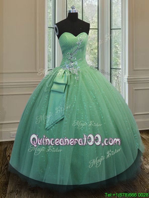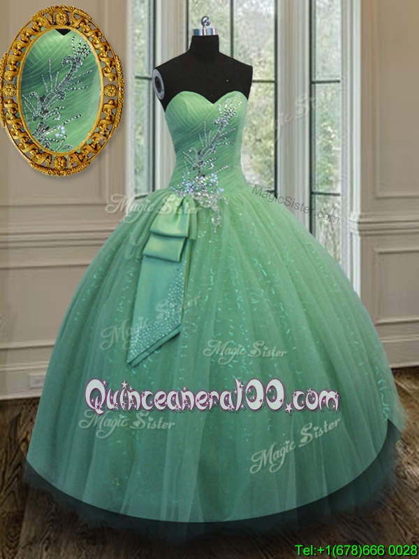 Neckline : SweetheartShown Color : GreenSilhouette : Ball GownsSleeve Length : sleevelessHemline : floor lengthBack Detail : Lace upFabric : Tulle,SequinedEmbellishment : Beading,Ruching,BowknotOccasion : Military Ball,Sweet 16,QuinceaneraSeason : Spring,Summer,Fall,Winter
