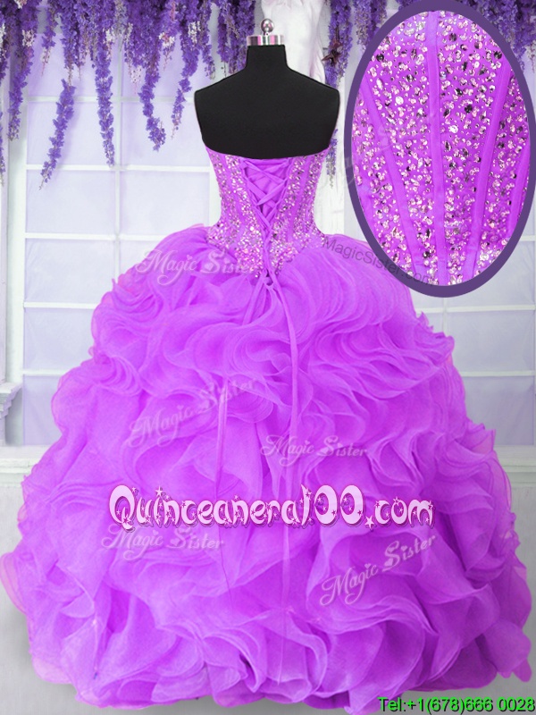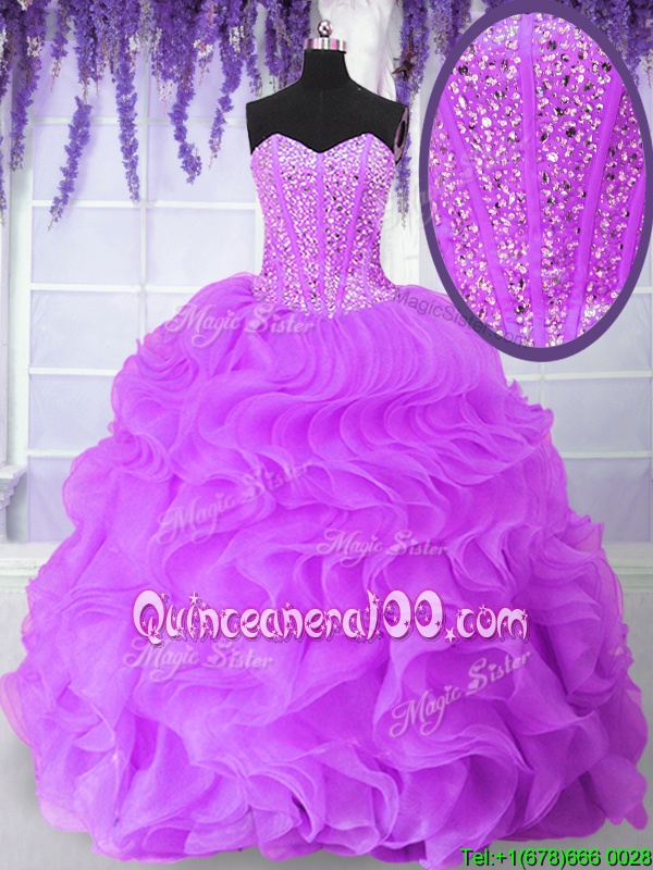 Discount Lilac Ball Gowns Sweetheart Sleeveless Organza Floor Length Lace Up Beading and Ruffles Sweet 16 Dresses
