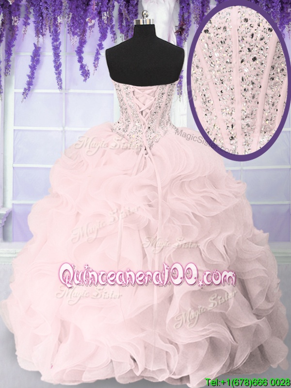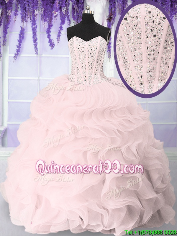 Neckline : SweetheartShown Color : Pink Silhouette : Ball GownsSleeve Length : sleevelessHemline : floor lengthBack Detail : Lace upFabric : OrganzaEmbellishment : Beading,RufflesOccasion : Military Ball,Sweet 16,QuinceaneraSeason : Spring,Summer,Fall,Winter