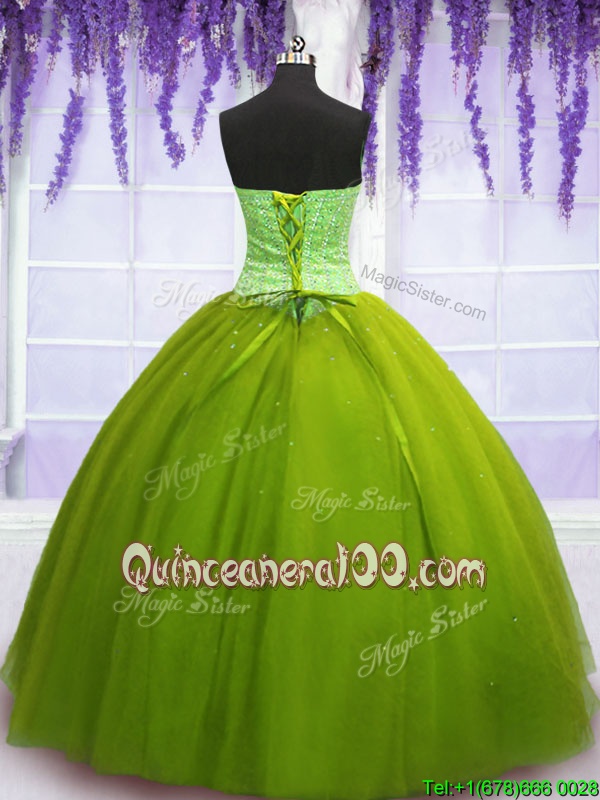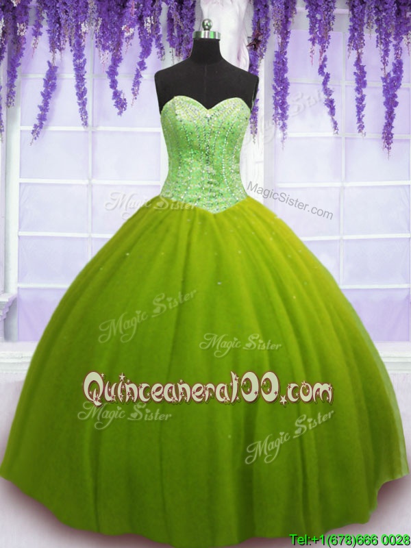 Neckline : SweetheartShown Color : Olive GreenSilhouette : Ball GownsSleeve Length : sleevelessHemline : floor lengthBack Detail : Lace upFabric : TulleEmbellishment : BeadingOccasion : Military Ball,Sweet 16,QuinceaneraSeason : Spring,Summer,Fall,Winter