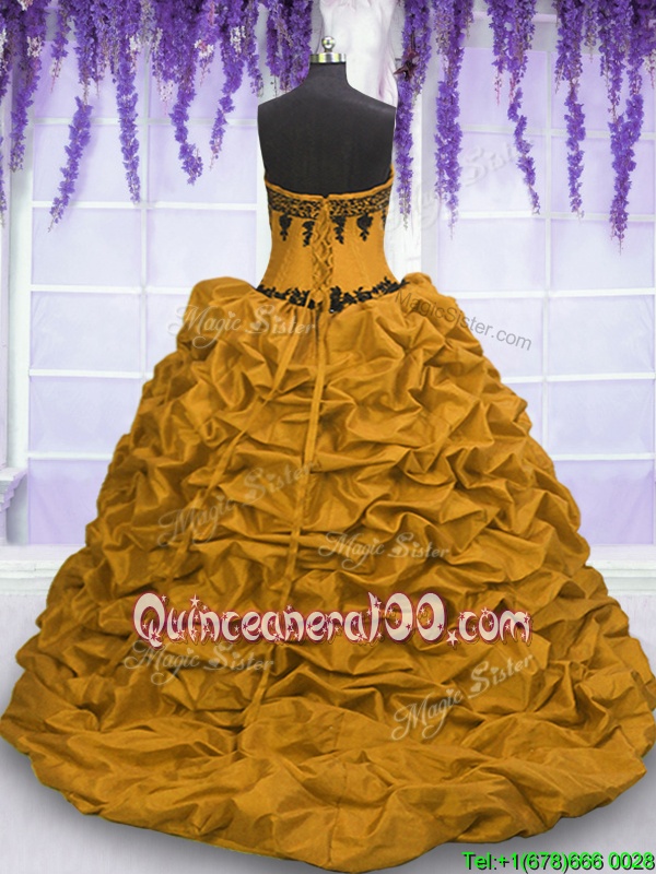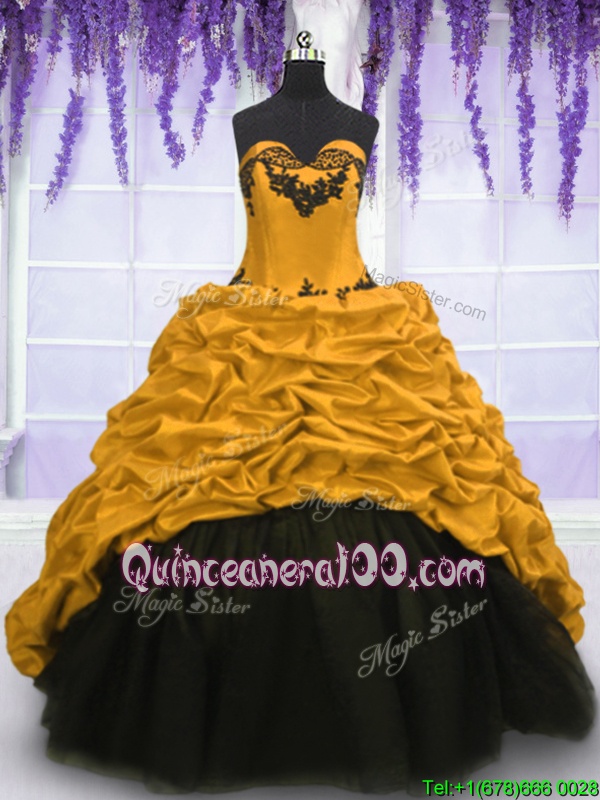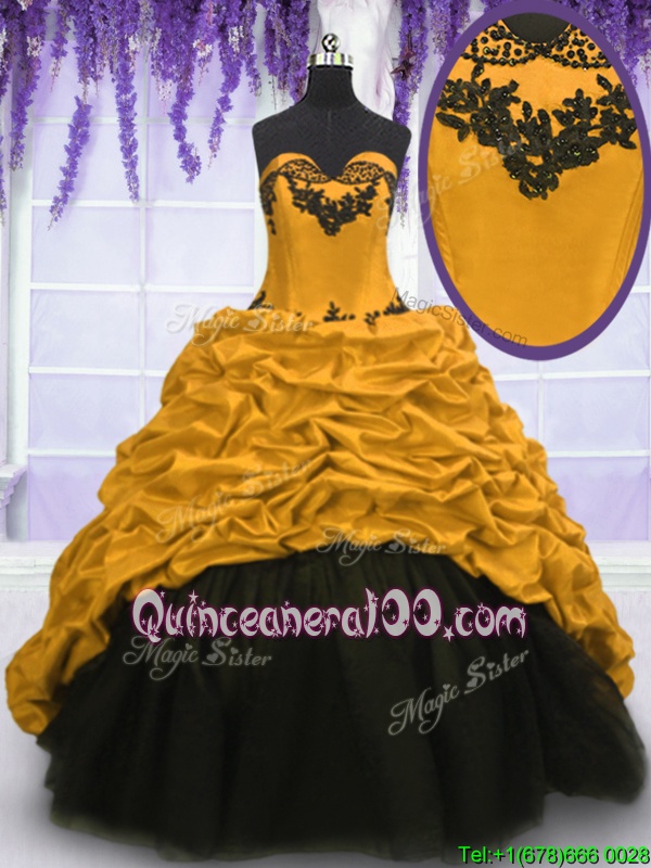 Neckline : SweetheartShown Color : Black,GoldSilhouette : Ball GownsSleeve Length : sleevelessBack Detail : Lace upFabric : TaffetaEmbellishment : Appliques,Pick UpsOccasion : Military Ball,Sweet 16,QuinceaneraSeason : Spring,Summer,Fall,Winter