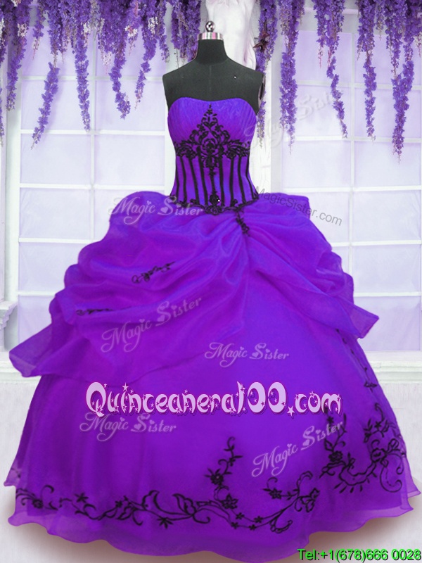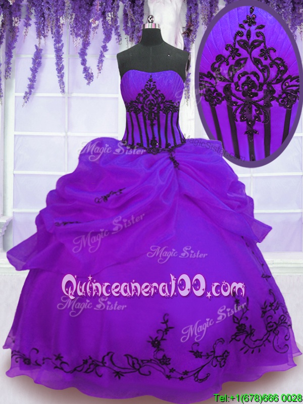 Neckline : StraplessShown Color : PurpleSilhouette : Ball GownsSleeve Length : sleevelessHemline : floor lengthBack Detail : Lace upFabric : OrganzaEmbellishment : EmbroideryOccasion : Military Ball,Sweet 16,QuinceaneraSeason : Spring,Summer,Fall,Winter