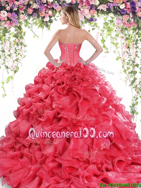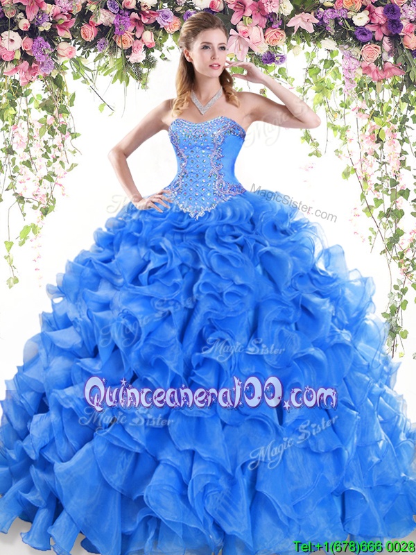 Neckline : SweetheartShown Color : BlueSilhouette : Ball GownsSleeve Length : sleevelessBack Detail : Lace upFabric : OrganzaEmbellishment : Beading,RufflesOccasion : Military Ball,Sweet 16,QuinceaneraSeason : Spring,Summer,Fall,Winter