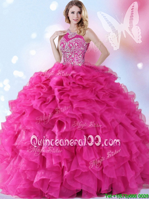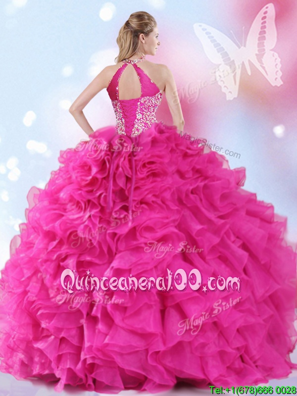 Neckline : Halter topShown Color : Hot PinkSilhouette : Ball GownsSleeve Length : sleevelessHemline : floor lengthBack Detail : Lace upFabric : OrganzaEmbellishment : Beading,RufflesOccasion : Military Ball,Sweet 16,QuinceaneraSeason : Spring,Summer,Fall,Winter