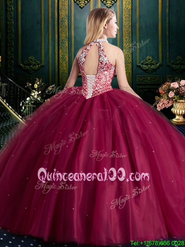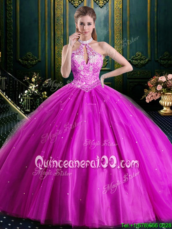 Neckline : Halter topShown Color : FuchsiaSilhouette : Ball GownsSleeve Length : sleevelessHemline : floor lengthBack Detail : Lace upFabric : TulleEmbellishment : Beading,Lace,AppliquesOccasion : Military Ball,Sweet 16,QuinceaneraSeason : Spring,Summer,Fall,Winter