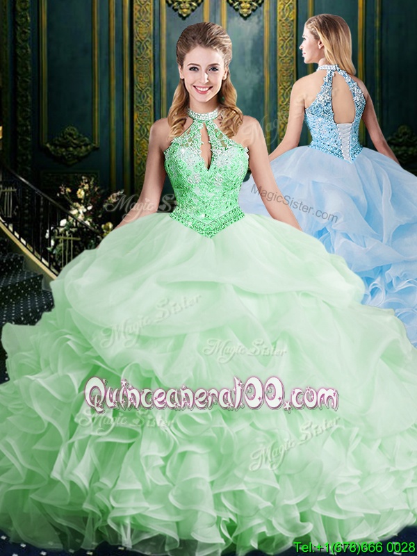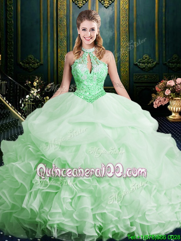 Elegant Halter Top Sleeveless Vestidos de Quinceanera Brush Train Beading and Lace and Appliques and Ruffles and Pick Ups Spring Green Organza