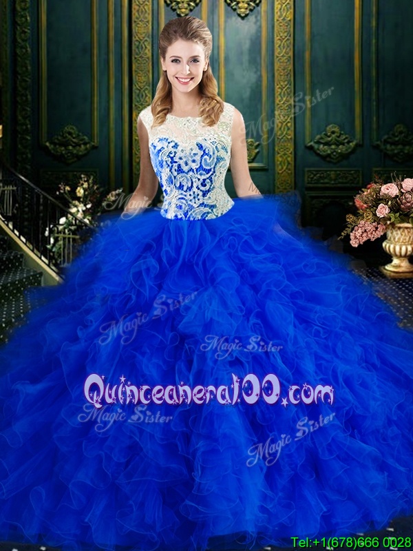 Neckline : ScoopShown Color : Royal BlueSilhouette : Ball GownsSleeve Length : sleevelessHemline : floor lengthBack Detail : ZipperFabric : TulleEmbellishment : Lace,RufflesOccasion : Military Ball,Sweet 16,QuinceaneraSeason : Spring,Summer,Fall,Winter