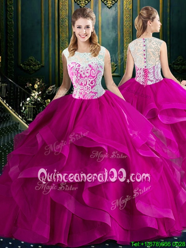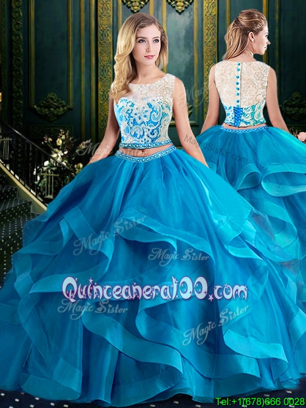 Neckline : ScoopShown Color : Baby BlueSilhouette : Two PiecesSleeve Length : sleevelessHemline : with trainBack Detail : ZipperFabric : TulleEmbellishment : Lace,RufflesOccasion : Military Ball,Sweet 16,QuinceaneraSeason : Spring,Summer,Fall,Winter