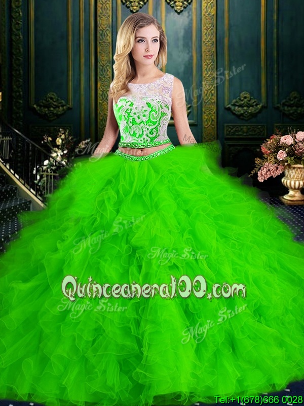 Neckline : ScoopShown Color : Spring GreenSilhouette : Two PiecesSleeve Length : sleevelessHemline : floor lengthBack Detail : ZipperFabric : TulleEmbellishment : Lace,RufflesOccasion : Military Ball,Sweet 16,QuinceaneraSeason : Spring,Summer,Fall,Winter