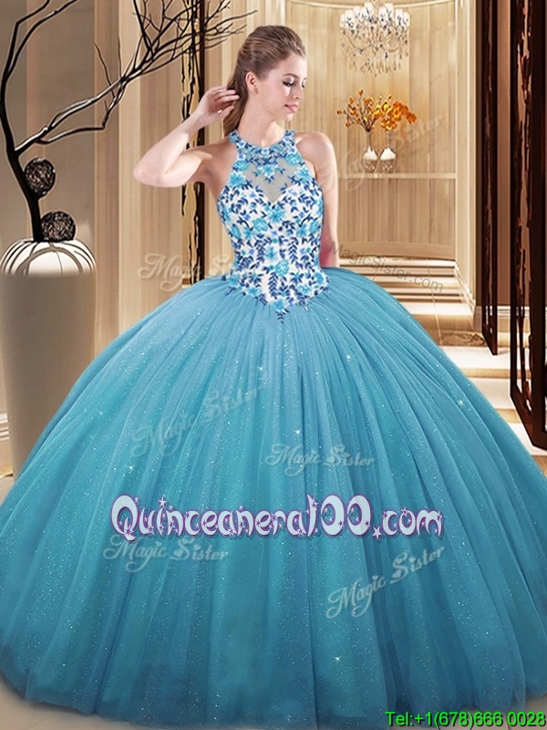 Neckline : High-neckShown Color : Baby BlueSilhouette : Ball GownsSleeve Length : sleevelessHemline : floor lengthBack Detail : Lace upFabric : TulleEmbellishment : Lace,AppliquesOccasion : Military Ball,Sweet 16,QuinceaneraSeason : Spring,Summer,Fall,Winter