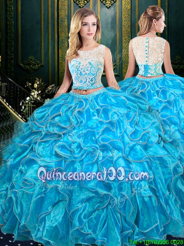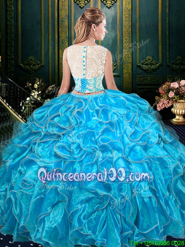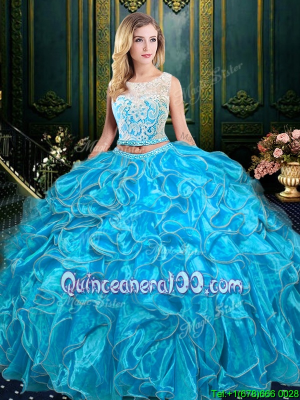 Neckline : ScoopShown Color : Baby BlueSilhouette : Two PiecesSleeve Length : sleevelessHemline : floor lengthBack Detail : ZipperFabric : OrganzaEmbellishment : Lace,RufflesOccasion : Military Ball,Sweet 16,QuinceaneraSeason : Spring,Summer,Fall,Winter