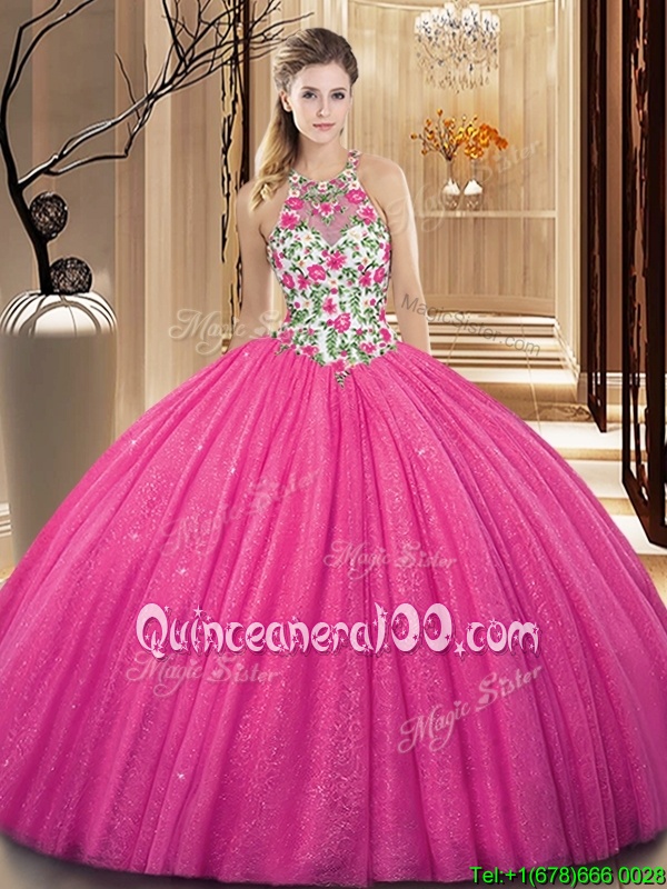 Neckline : ScoopShown Color : Hot PinkSilhouette : Ball GownsSleeve Length : sleevelessHemline : floor lengthBack Detail : BacklessFabric : TulleEmbellishment : Embroidery,SequinsOccasion : Military Ball,Sweet 16,QuinceaneraSeason : Spring,Summer,Fall,Winter