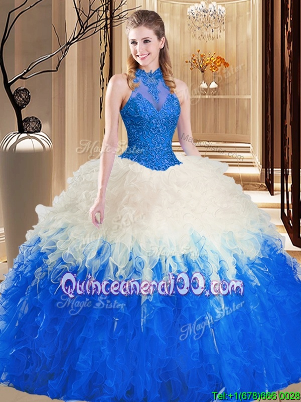 Neckline : High-neckShown Color : Multi-colorSilhouette : Ball GownsSleeve Length : sleevelessHemline : floor lengthBack Detail : BacklessFabric : TulleEmbellishment : Lace,Appliques,RufflesOccasion : Military Ball,Sweet 16,QuinceaneraSeason : Spring,Summer,Fall,Winter