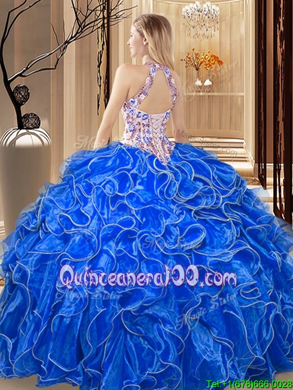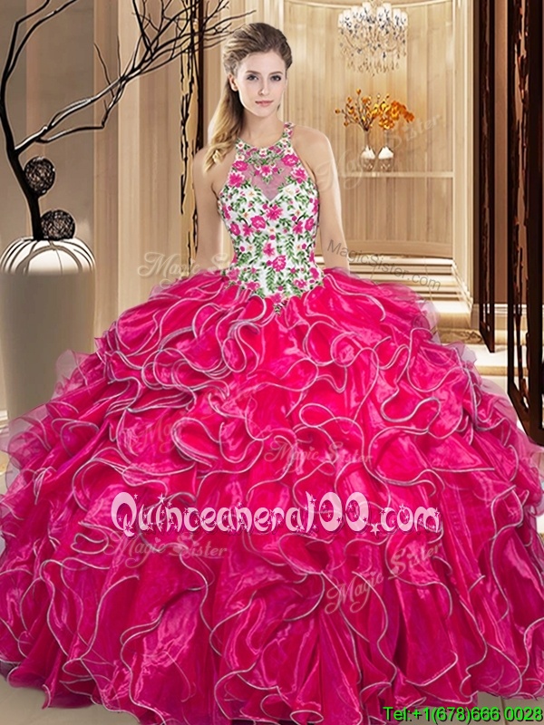 Neckline : ScoopShown Color : Hot PinkSilhouette : Ball GownsSleeve Length : sleevelessHemline : floor lengthBack Detail : BacklessFabric : OrganzaEmbellishment : Embroidery,RufflesOccasion : Military Ball,Sweet 16,QuinceaneraSeason : Spring,Summer,Fall,Winter
