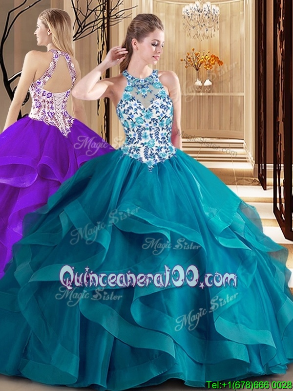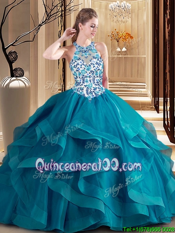 Neckline : ScoopShown Color : Teal Silhouette : Ball GownsSleeve Length : sleevelessBack Detail : Lace upFabric : TulleEmbellishment : Embroidery,RufflesOccasion : Military Ball,Sweet 16,QuinceaneraSeason : Spring,Summer,Fall,Winter