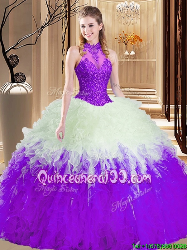 Neckline : High-neckShown Color : White And PurpleSilhouette : Ball GownsSleeve Length : sleevelessHemline : floor lengthBack Detail : Lace upFabric : TulleEmbellishment : Lace,Appliques,RufflesOccasion : Military Ball,Sweet 16,QuinceaneraSeason : Spring,Summer,Fall,Winter