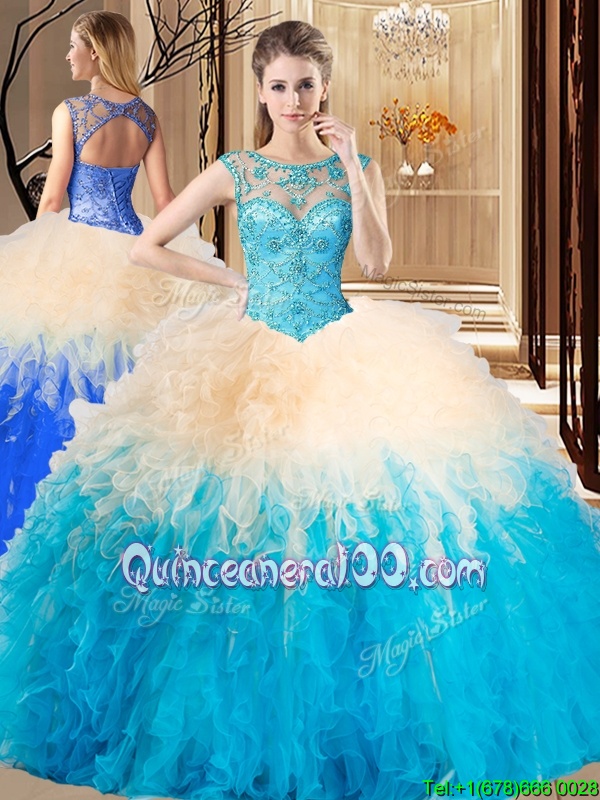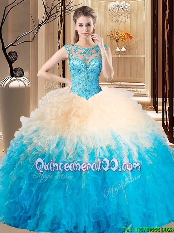 Neckline : High-neckShown Color : Aqua BlueSilhouette : Ball GownsSleeve Length : sleevelessHemline : floor lengthBack Detail : BacklessFabric : TulleEmbellishment : Beading,RufflesOccasion : Prom,Military Ball,Sweet 16,QuinceaneraSeason : Spring,Summer,Fall,Winter