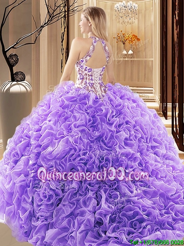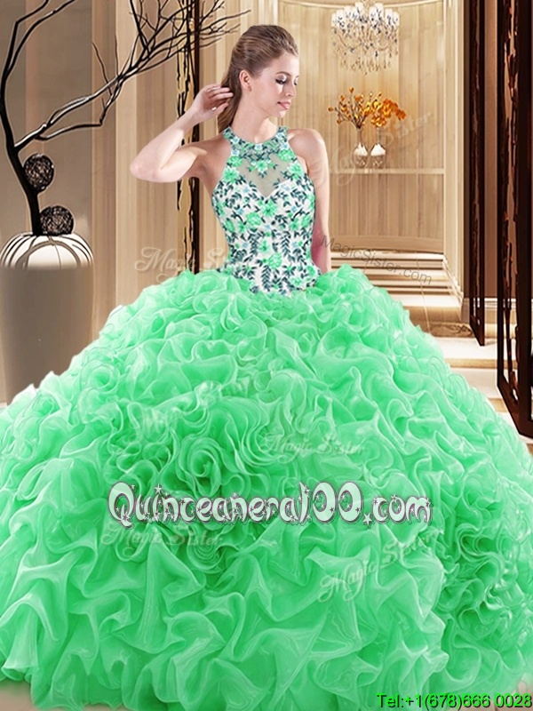 Neckline : High-neckShown Color : Spring GreenSilhouette : Ball GownsSleeve Length : sleevelessBack Detail : BacklessFabric : OrganzaEmbellishment : Embroidery,RufflesOccasion : Prom,Military Ball,Sweet 16,QuinceaneraSeason : Spring,Summer,Fall,Winter